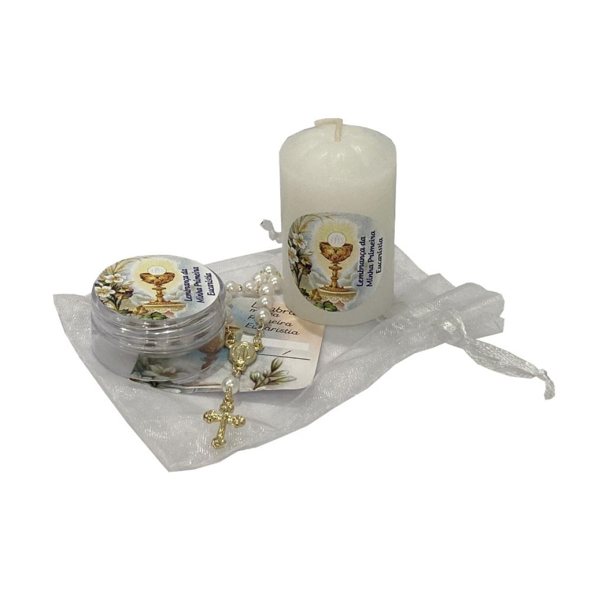 2. KT112090 - Kit Primeira Eucaristia c/ Caixinha de Acrílico, Dezena, Cartão e Vela