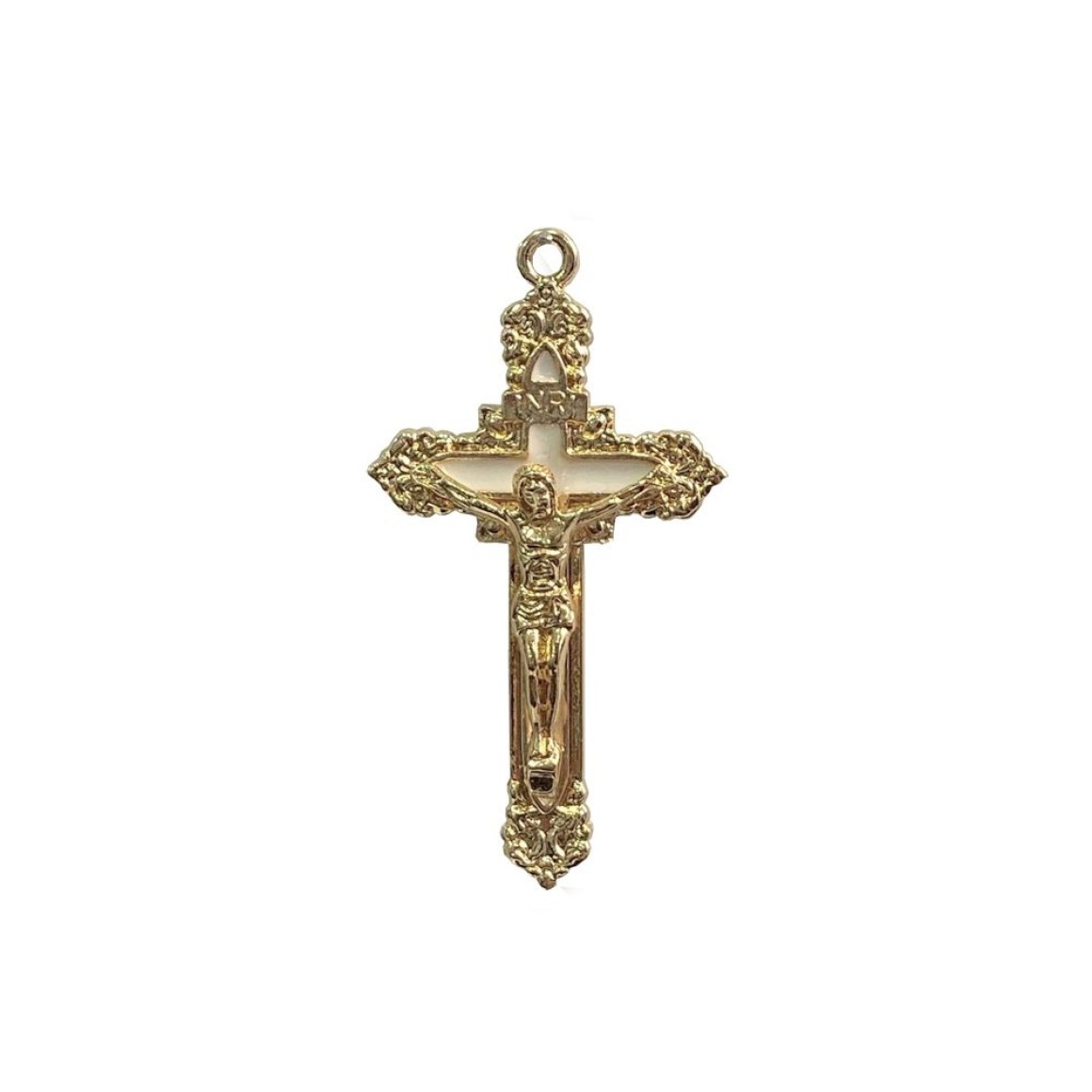 *Crucifixo Metal Dourado Resinado Branco - 7,6x4,1cm.