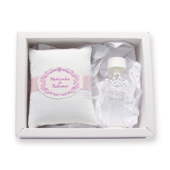 KT75678 - Kit Batismo de Madrinha c/ Almofada e Vidrinho p/ Água Benta - 11x14cm